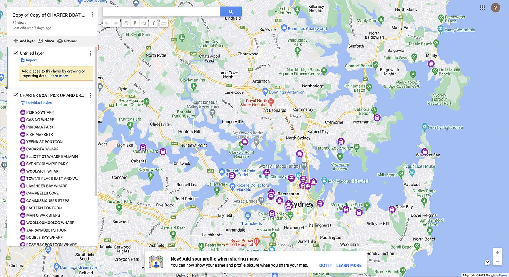 Some popular wharf locations are on the map below. Inquire about your preferred location, and we will confirm suitability for your chosen boat.